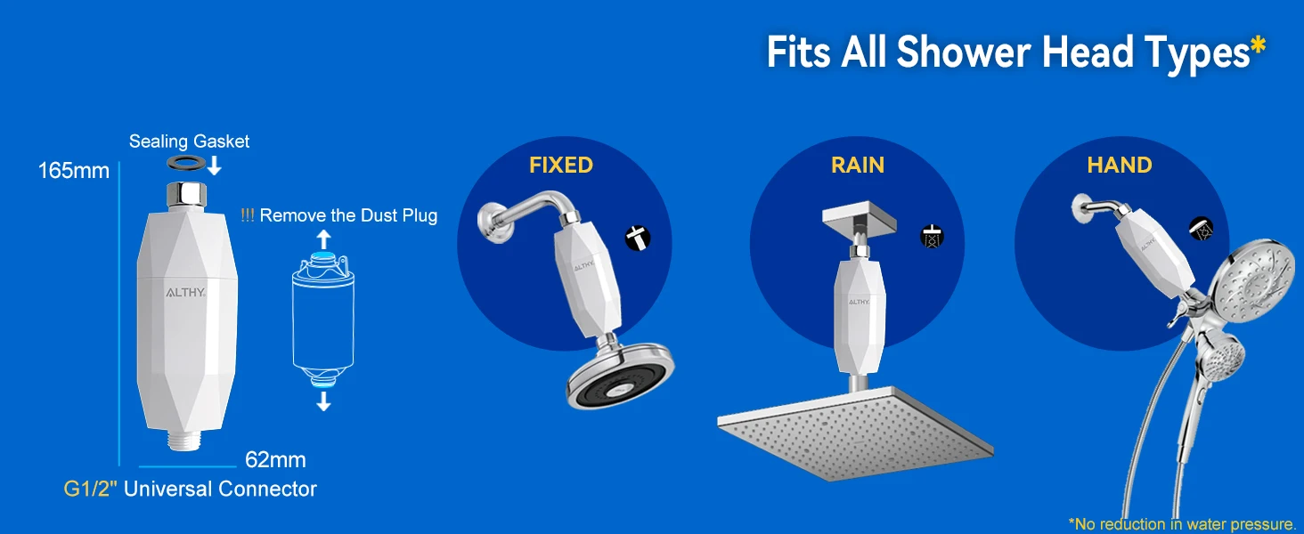 Filters out chlorine, rust, and sediments to protect your hair and skin.